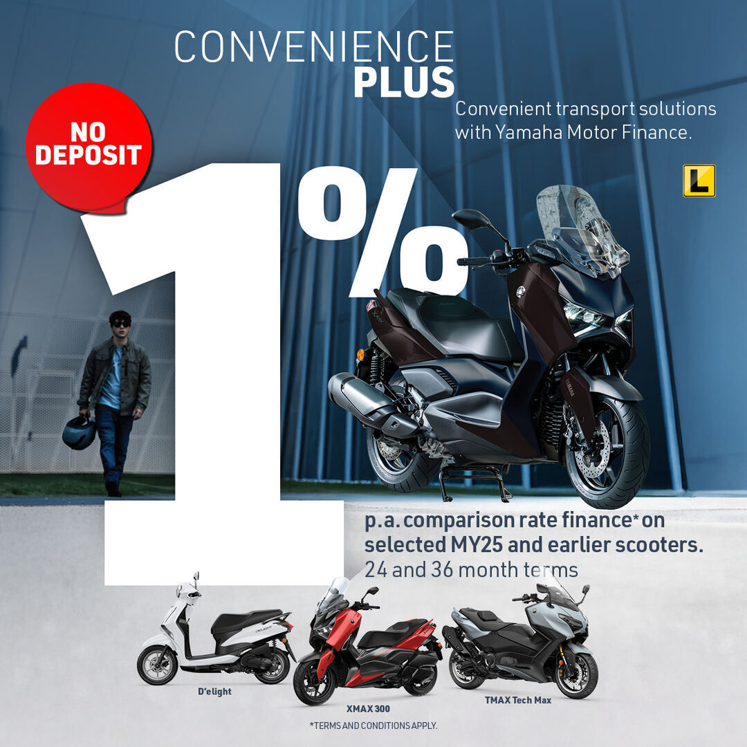 *Finance available to approved personal applicants or commercial applicants with a registered valid ABN (excludes fleet, government and rental buyers). A 1% p.a. Comparison rate is available on new MY25 or earlier D’elight, XMAX 300 and TMAX 560 models on a term of 24 or 36 months, with no application or monthly account keeping fees. A Dealer Administration Fee may be applicable. Credit criteria, fees, charges, terms and conditions apply. Comparison rate is based on a 3-year secured fixed rate consumer loan of $10,000. WARNING: The comparison rate is true only for the example given and may not include all fees and charges. Different terms, fees or other loan amounts might result in a different comparison rate. Offer available from participating Yamaha dealers from 01/01/2026 until 30/06/2026 and settled no later than 31/07/2026. Excludes any other offers. While stocks last. Finance is provided by Yamaha Motor Finance Australia Pty Ltd. ABN 29 101 928 670, Australian Credit Licence No 394553.